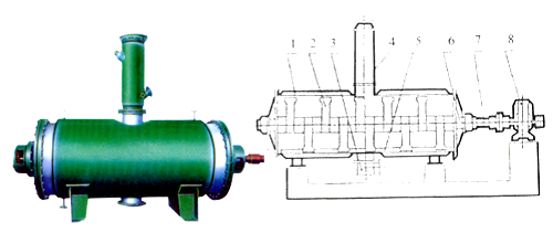 具有結(jié)構(gòu)簡單,操作方便,使用周期長,性能穩(wěn)定可靠,蒸汽耗量小,適用性能強,產(chǎn)品質(zhì)量好,特別適用于不耐高溫、易燃、調(diào)溫下易氧化的膏狀物料的干燥,該機經(jīng)用戶長期使用證明是一良好的干燥設(shè)備。原理:被干燥物料從殼體上方正中間加入,在不斷正反轉(zhuǎn)動的耙齒的攪拌下,物料軸向來回走動,與殼體內(nèi)壁接觸的表面不斷更新,受到蒸汽的間接加熱,耙齒的均勻攪拌,粉碎棒的粉碎,使物料表面水分更有利的排出,氣化的水分經(jīng)干式除塵器、濕式除塵器、冷凝器,從真空泵出口處放空。結(jié)構(gòu):真空耙式干燥機的主要部件。
